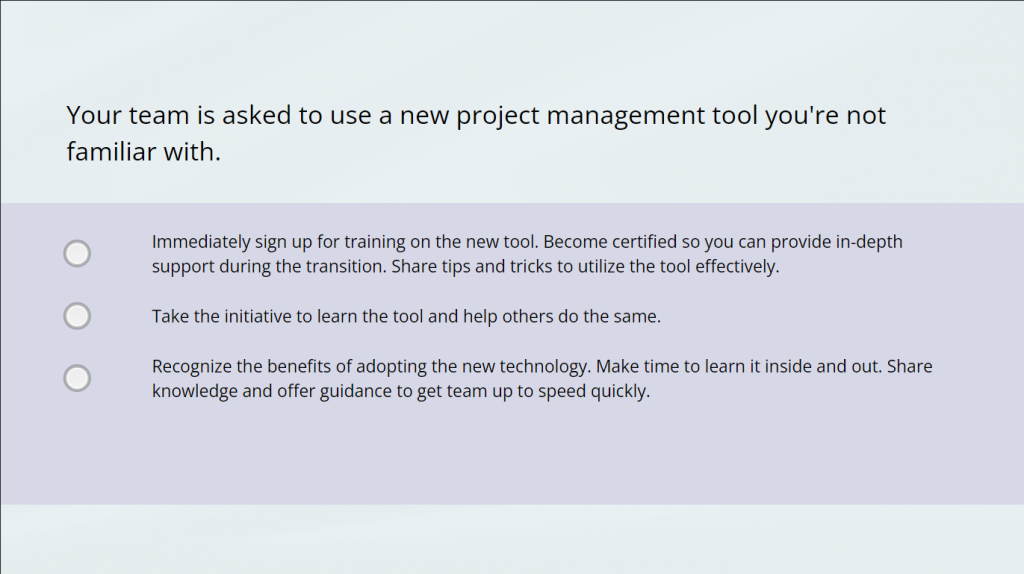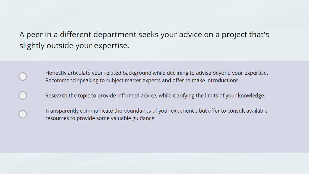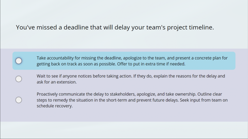The key to the assessment’s effectiveness lay in constructing a range of responses for each scenario that were not immediately identifiable as “bad,” “better,” or “best.” This approach was intended to compel users to engage more deeply with their decision-making processes and to reflect more critically on their choices. Initial responses were generated and then refined through multiple iterations, with a focus on making each potential answer realistic and viable, thus avoiding the common pitfall of users easily selecting the “best” answer without genuine reflection.