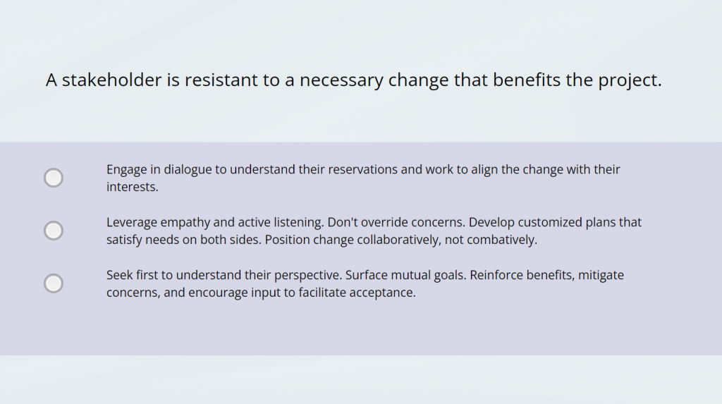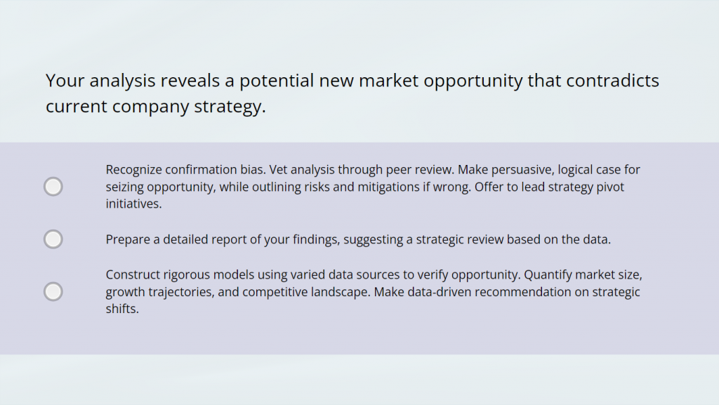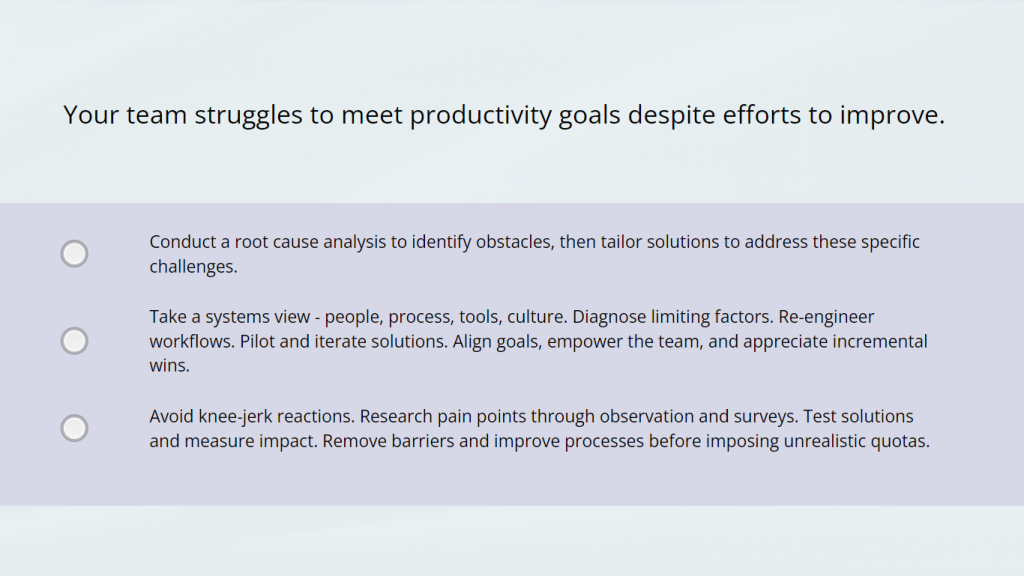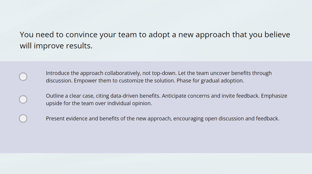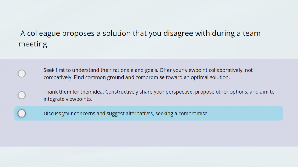 One of the main challenges encountered was ensuring that the assessment responses were balanced in such a way that they offered genuine insights into the users’ skill levels and potential areas for growth. Early iterations of the assessment produced responses that were too easily categorized, leading to a revision process aimed at nuancing the options. This required a sophisticated understanding of human behavior and professional dynamics, which was achieved through leveraging AI-based tools for initial generation, followed by careful manual refinement.
