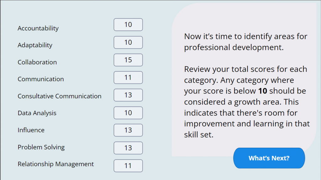 The final product was a comprehensive benchmark assessment tool that not only facilitates self-discovery among users but also provides them with actionable feedback and strategies for improvement in key professional skills. The assessment was designed with clear scoring guidelines to help users easily identify their strengths and areas for growth, coupled with practical suggestions for development in each skill area. The success of the project lies in its ability to combine technological innovation with a deep understanding of instructional design and human psychology, offering a valuable resource for individuals seeking to advance their careers.